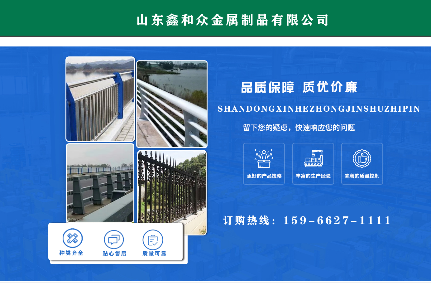 山東鑫和眾金屬制品有限公司主要產(chǎn)品有防撞護(hù)欄,橋梁護(hù)欄,道路護(hù)欄,河道護(hù)欄,不銹鋼護(hù)欄等護(hù)欄。提供設(shè)計方案,一站式定制,包您滿意價格優(yōu)惠,歡迎來電咨詢!    公司常年從事銷售護(hù)欄防撞護(hù)欄,橋梁護(hù)欄,道路護(hù)欄,河道護(hù)欄,不銹鋼護(hù)欄,橋梁鋼護(hù)欄,河道燈光護(hù)欄等。產(chǎn)品廣泛應(yīng)用于橋梁、河道、旅游景區(qū)、道路、公路、公園、小區(qū)、景觀、道路防撞等領(lǐng)域。    公司產(chǎn)品均采用優(yōu)質(zhì)不銹鋼材料,符合相關(guān)標(biāo)準(zhǔn)。各種型號不銹鋼復(fù)合管及護(hù)欄,質(zhì)量嚴(yán)格把控。產(chǎn)品強度高、耐腐蝕、焊接牢固、抗沖擊、性能好,防撞護(hù)欄結(jié)構(gòu)簡單、美觀實用大方。     歡迎前來訂購!...